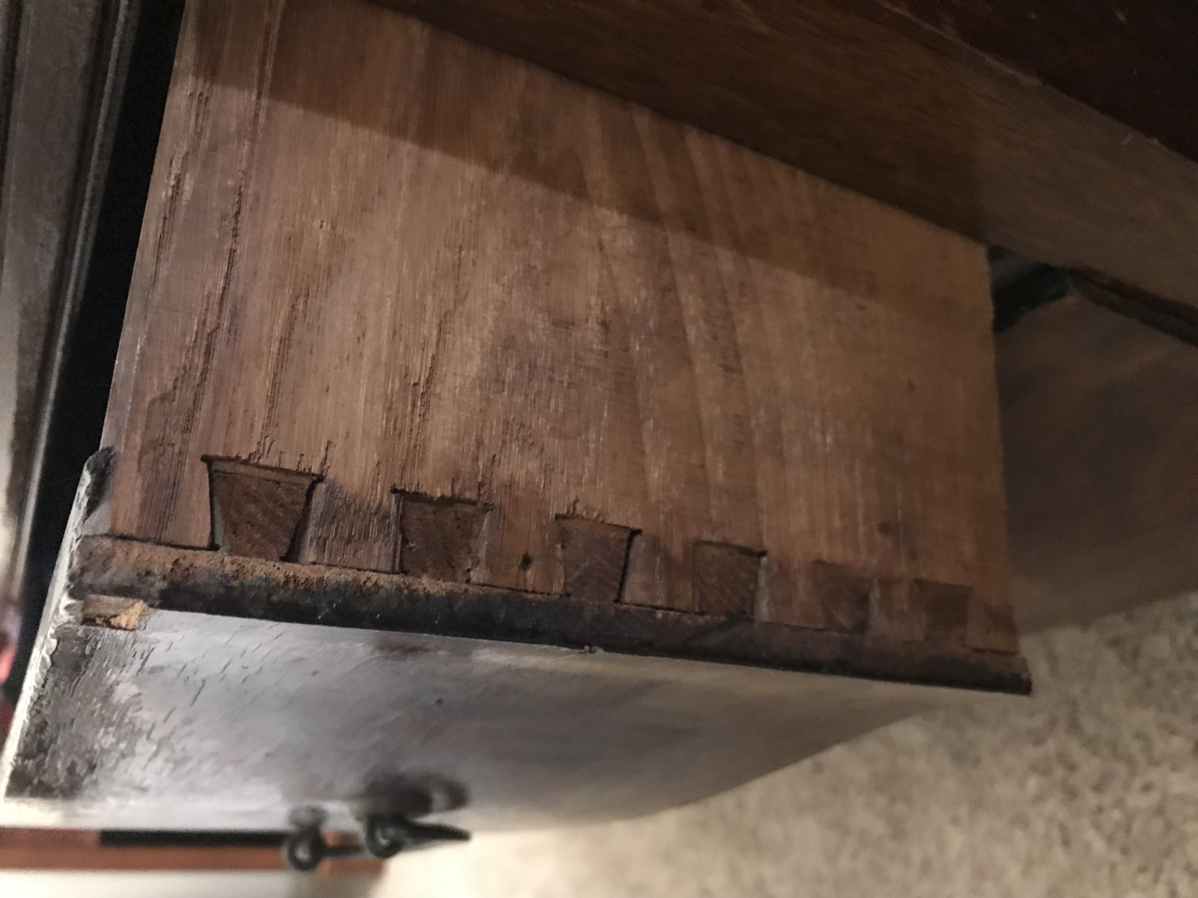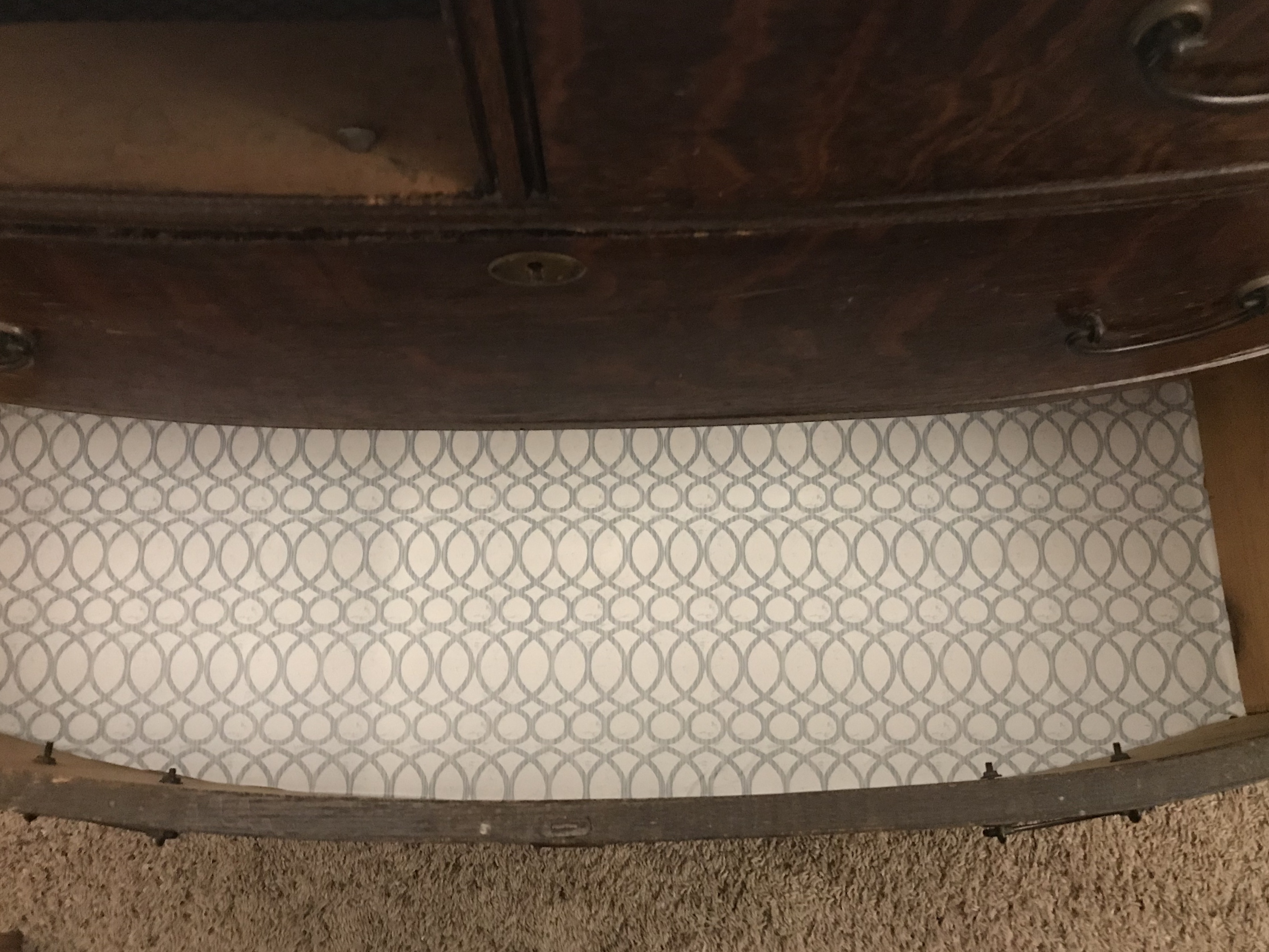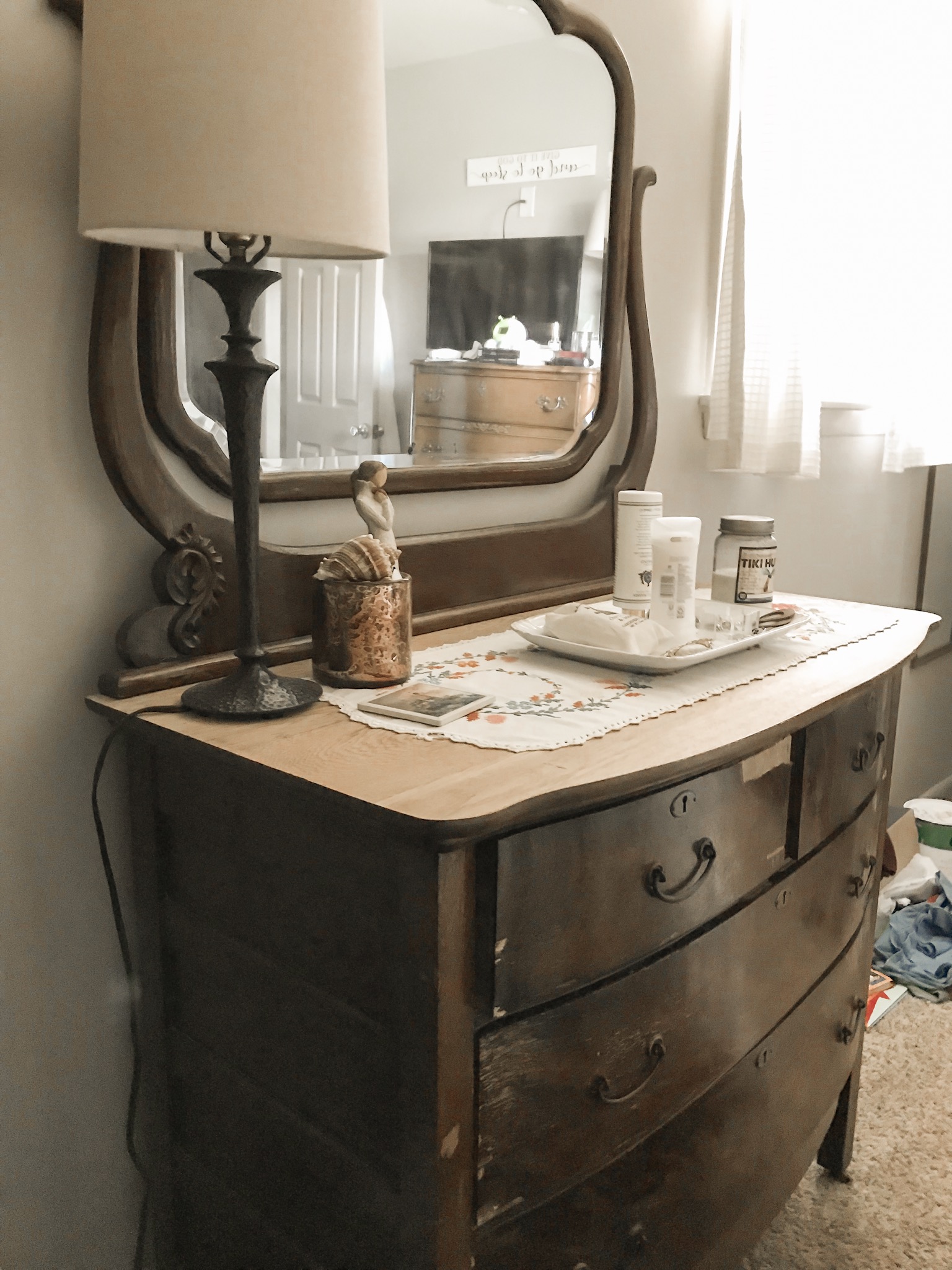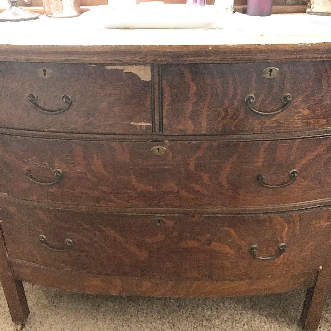 We are in the process of rehabbing the dresser, so that’s why it is half stripped. The veneer started peeling on the front. I plan to either paint it white or strip the varnish/stain and stain it a natural stain.